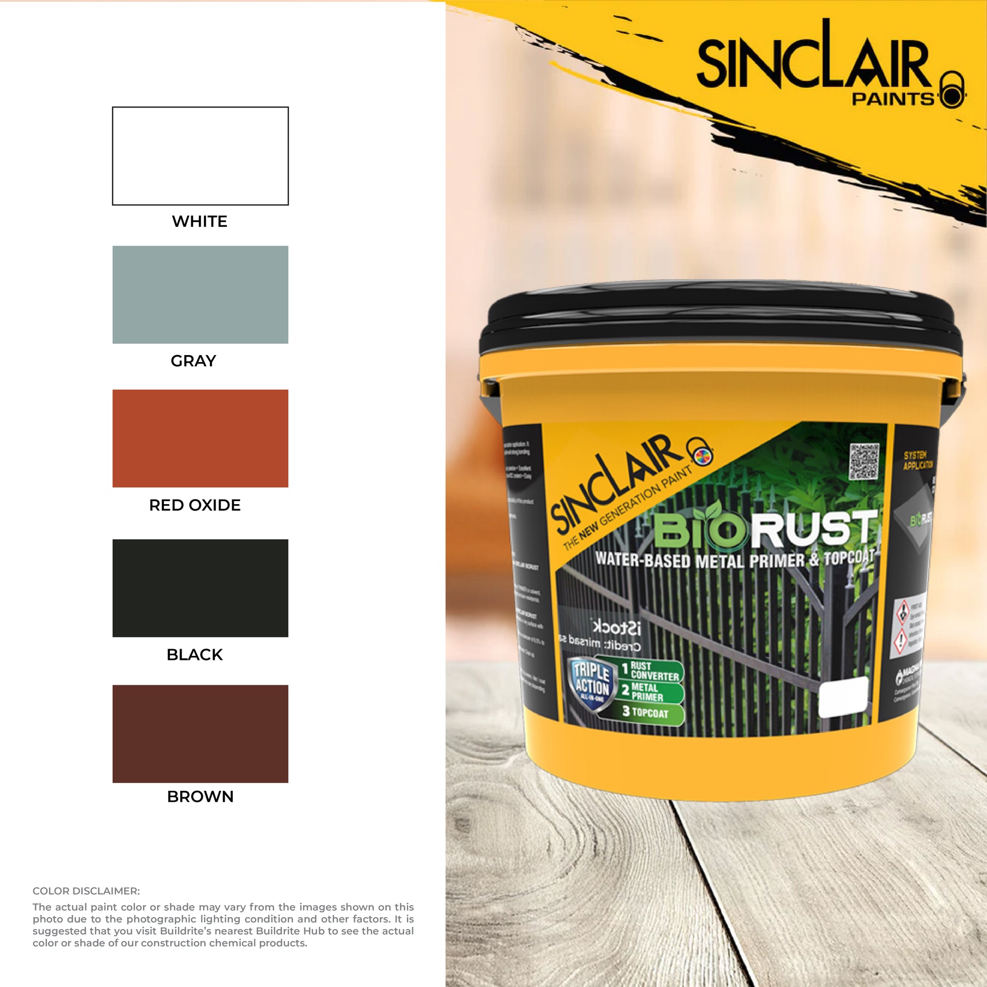 SINCLAIR BIORUST is a water-based hybrid metal primer and topcoat for indoor and outdoor application. It exhibits good corrosion resistance and protection. It also dries into a durable and flexible film with strong bonding to galvanized iron, steel, and other properly prepared metal surfaces.